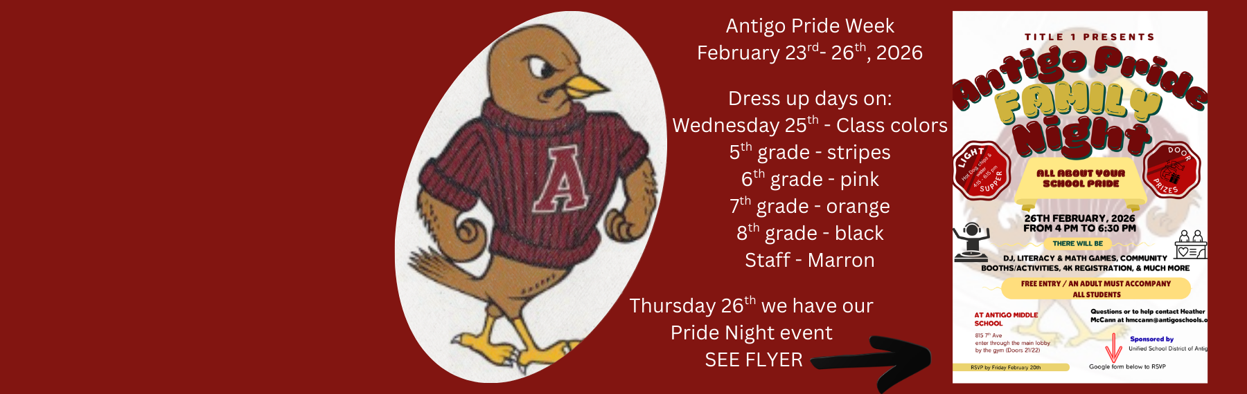 Upcoming Events No School Fri. February 13, 2026 Seal A Smile Mon. February 16, 2026 9:00 AM Seal A Smile Tue. February 17, 2026 9:00 AM Seal A Smile Wed. February 18, 2026 9:00 AM View all Events Announcements 4K-8 Antigo Pride Night Antigo Pride Family Night for grades 4K-8 will take place Thursday, February 26th at the Antigo Middle School from 4:00-6:30 PM. Read More on 4K-8 Antigo Pride Night Default Page
